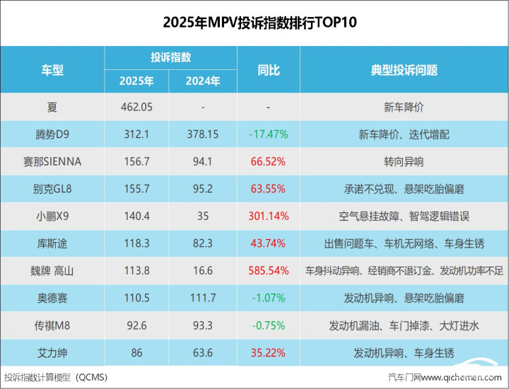数据显示:2025年度MPV的投诉指数达到了3190.35,同比上涨了27%。投诉榜单TOP10中,多数车型的投诉指数均出现了同比上涨。这其中,小鹏X9和魏牌高山的投诉指数均达到了三位数的增长。与之相反的是,腾势D9、奥德赛、传祺M8的投诉指数呈现下滑态势。尤其是腾势D9,投诉指数同比下滑了17.47%,成为榜单中下滑幅度最大的车型。