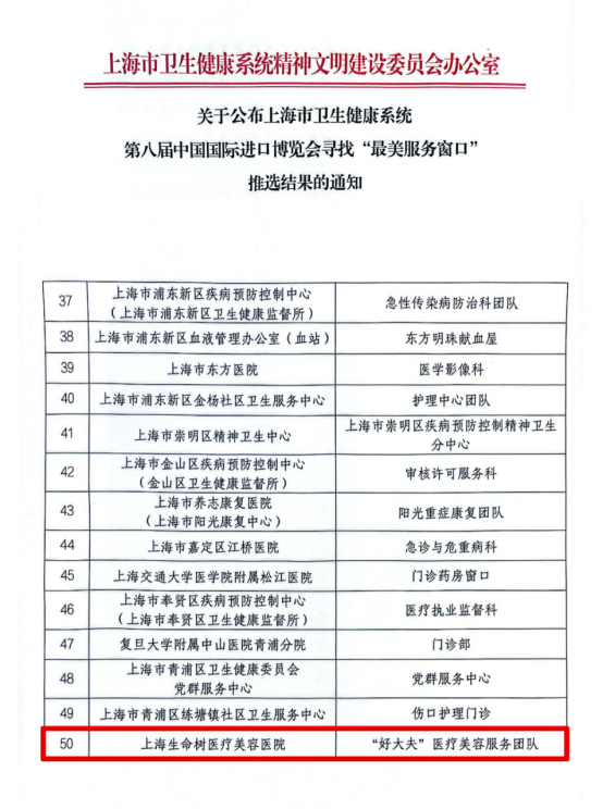 近日,上海生命树医疗美容医院“好大夫”服务团队凭借专业的医疗实力、优质的服务体验及行业标杆性表现,获评第八届中国国际进口博览会“最美服务窗口”,成为医美行业唯一获此殊荣的服务团队,彰显了其在医疗服务与国际交流领域的双重实力。